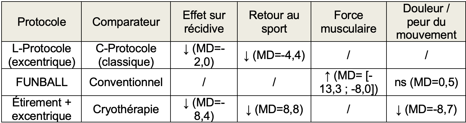 Les exercices excentriques (L-protocol) ont significativement réduit les taux de récidive et accéléré le retour au sport par rapport aux protocoles classiques. Le FUNBALL a renforcé la force excentrique et isométrique, sans effet clair sur la douleur. Les protocoles sans douleur (étirement + excentrique) ont permis une récupération plus rapide et une diminution de la kinésiophobie comparativement à la cryothérapie. La cryothérapie seule montre une efficacité limitée. Les études soulignent l’importance du contrôle neuromusculaire et de la coordination dans la prévention des rechutes, bien que ces aspects soient peu explorés. Les auteurs notent néanmoins une hétérogénéité importante entre études (fréquence, durée, intensité).